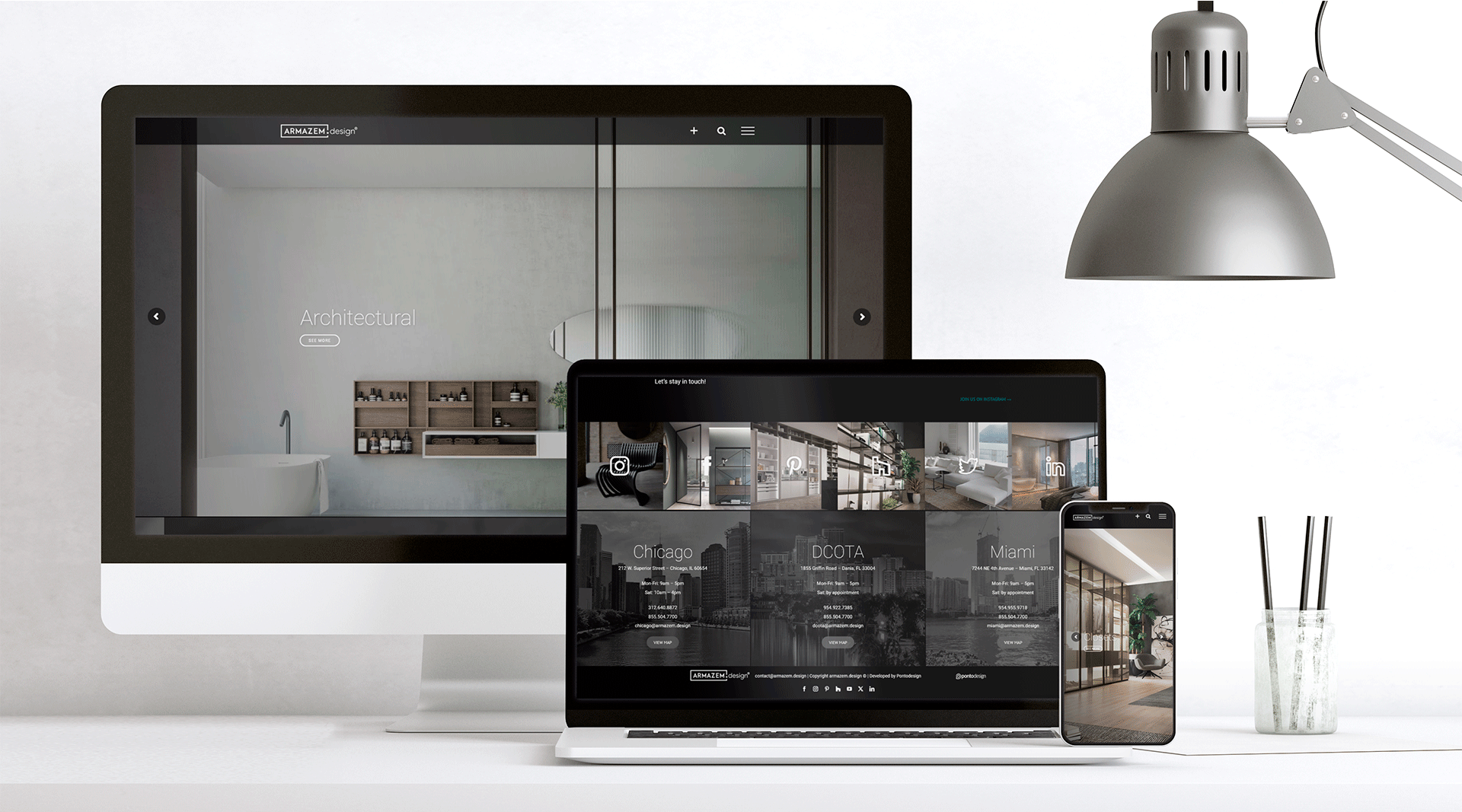 Dentre todos os itens desenvolvidos para o ARMAZEM.design, o site foi a ferramenta mais importante para a apresentação da marca, visto que ele consegue apresentar em grande parte de maneira impactante e clara a estrutura, a linguagem e identidade, além da própria expertise da empresa em desenvolver ambientes de alta qualidade e design, mostrando seu diferencial diretamente em seus projetos únicos.
