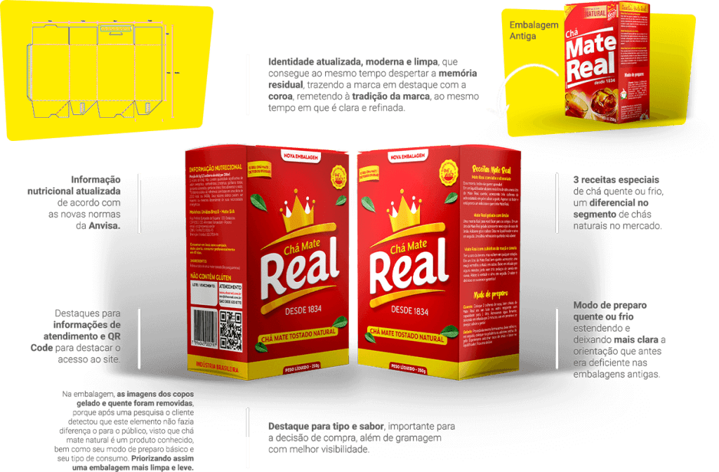 A Chás Real, fundada em 1904 e uma das maiores fabricantes de chá do Brasil, buscou uma agência para melhorar seu desempenho comercial. O trabalho envolveu a revitalização da marca, identidade visual e embalagens. Para aumentar o impacto no ponto de venda, reforçar laços com o público atual e tentar atrair um público mais jovem, era necessário um design moderno, mantendo a essência da marca.