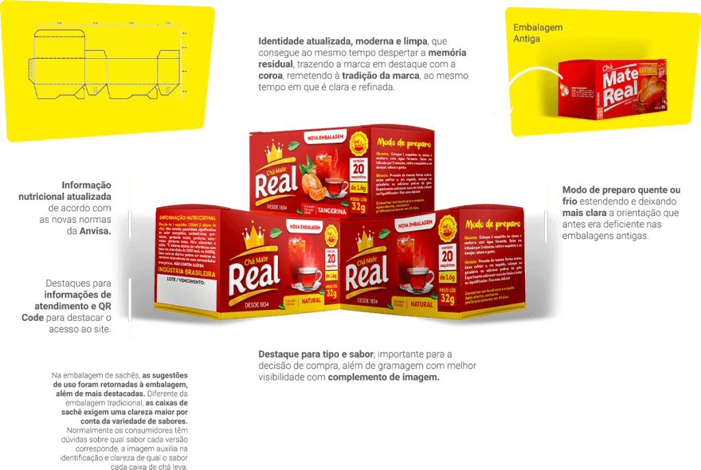 O grande desafio no redesenho da marca e embalagens da Chás Real era preservar a referência ao design original, marcante para os consumidores. A nova tipografia manteve peso e disposição, porém tornou-se mais amigável e impactante. A cor vermelha, presente na identidade da marca desde o primeiro rótulo, ganhou destaque. Com o redesenho cuidadoso das embalagens, a Chás Real ganhou nova vida nas gôndolas, mantendo a essência tradicional e reforçando sua presença como uma das marcas mais queridas e reconhecidas do mercado.