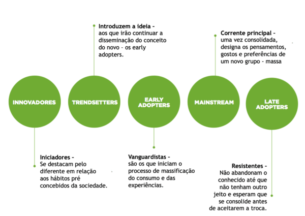 Uma tendência inicia com os Inovadores, que são os primeiros a adotar uma nova tendência e continua entre os disseminadores, em especial os Trendesetters, que disseminam o conceito, pois têm alto grau de liderança de opinião entre as outras categorias de adotantes. Os Early adopters, que iniciam o processo de massificação do consumo. Quando uma tendência atinge o Mainstream, ou seja, está consolidada na sociedade, ela está perdendo sua intensidade e irá ser substituída. E ainda temos os Late adopters, que são os retardatários e bastante resistentes em aceitar as mudanças.
