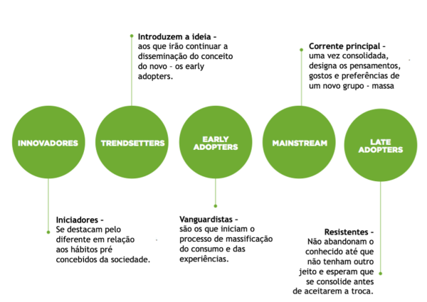 Uma tendência inicia com os Inovadores, que são os primeiros a adotar uma nova tendência e continua entre os disseminadores, em especial os Trendesetters, que disseminam o conceito, pois têm alto grau de liderança de opinião entre as outras categorias de adotantes. Os Early adopters, que iniciam o processo de massificação do consumo. Quando uma tendência atinge o Mainstream, ou seja, está consolidada na sociedade, ela está perdendo sua intensidade e irá ser substituída. E ainda temos os Late adopters, que são os retardatários e bastante resistentes em aceitar as mudanças.